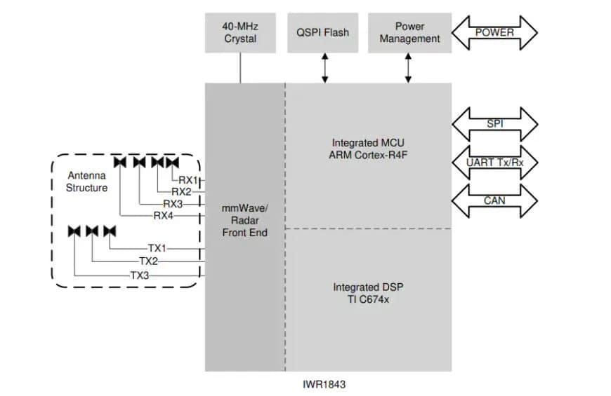Los componentes principales del radar de ondas milimétricas incluyen una antena transceptora. (Texas&RX), unidad de radiofrecuencia (RF), convertidor analógico a digital (CAD), procesador de señal digital (DSP), microcontrolador (MCU), etc.. RF, CAD, DSP, MCU, etc.. se integran directamente en un SOC a través del proceso CMOS.