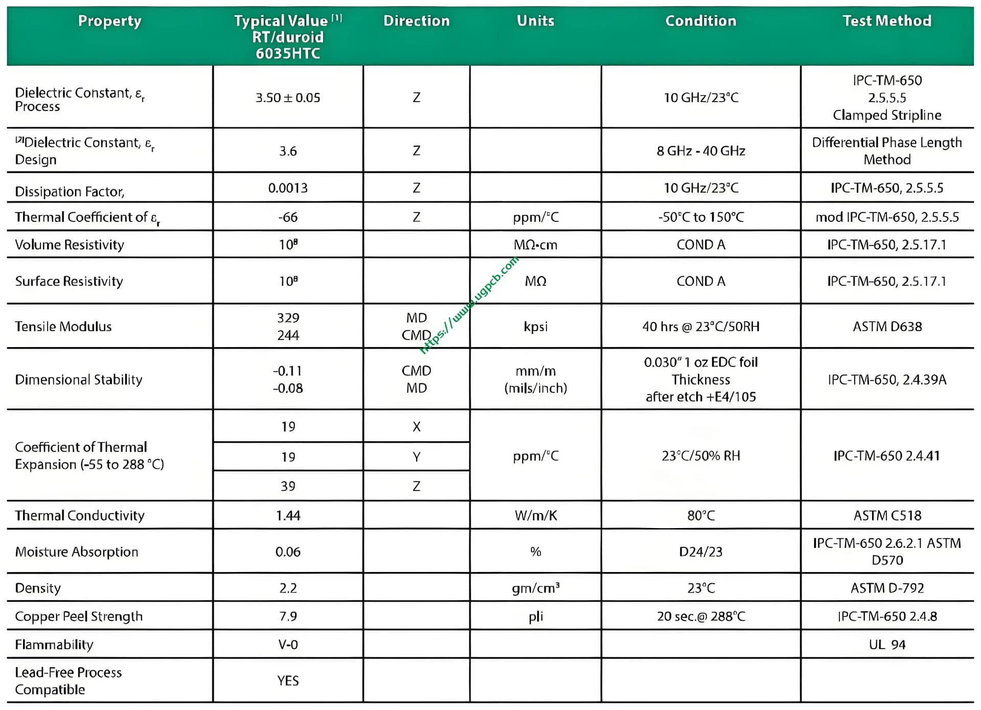 Rogers PCB RT/duroid 6035HTC high frequency circuit materials are ceramic filled PTFE composites designed for use in high power RF and microwave applications. This material is an exceptional choice for demanding high power scenarios, offering superior thermal conductivity and excellent long-term thermal stability with copper foil (ED and reverse treat).