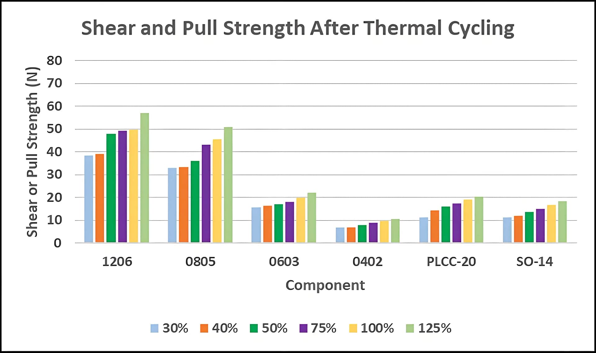 The experiment also simulated thermal cycling conditions (-40°C to 125°C, 1000 دورات) to study the long-term reliability of solder joint strength. Results indicated that thermal cycling significantly reduces solder joint strength, particularly under low solder paste volume conditions. على سبيل المثال, the shear force for a 0402 component at 25% solder paste volume decreased from 0.68Kgf to 0.55Kgf after thermal cycling, falling below the acceptable standard.
