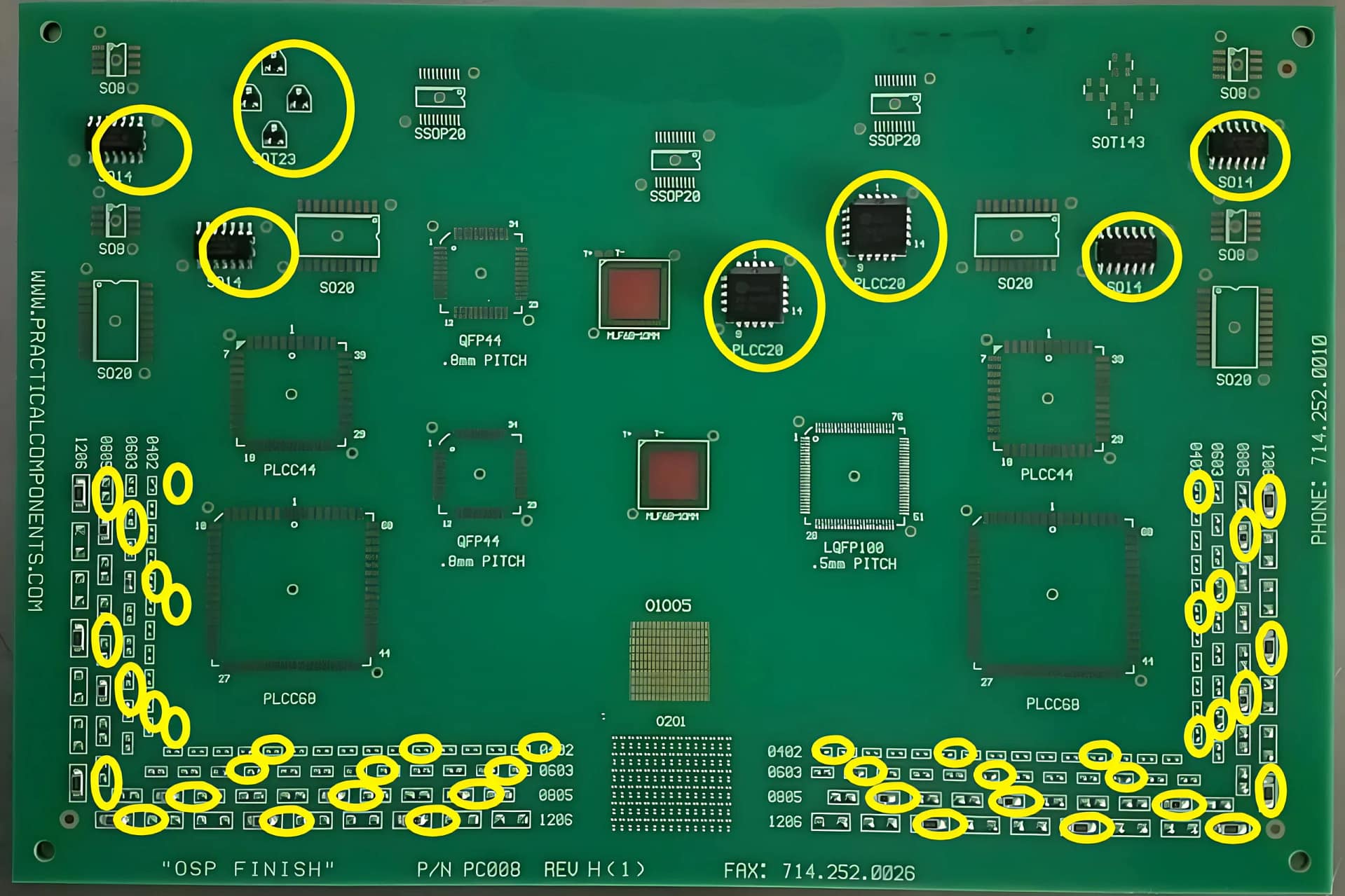 The experiment selected a variety of common SMT components, including passive components such as 0402, 0603, 0805, و 1206, as well as leaded components like SOT23, SO14, and PLCC20. By adjusting solder paste volume, stencil thickness, and printing parameters, different soldering conditions were simulated to evaluate the factors affecting solder joint strength.