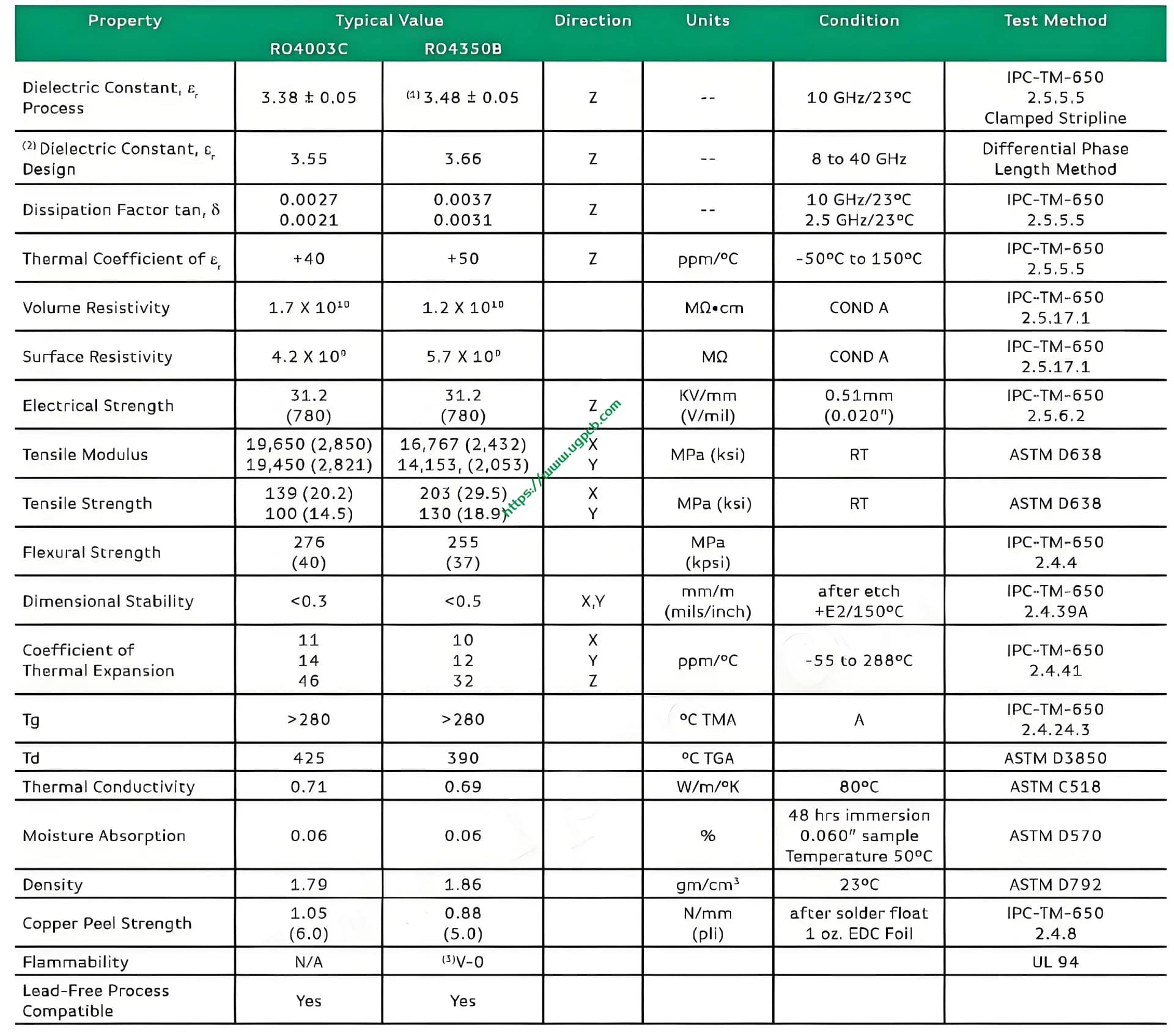 Rogers Ro4003C-Materialien sind nicht brominiert und nicht ul ul 94 V-0 bewertet. Für Anwendungen oder Designs, die eine UL erfordern 94 V-0 Flammenbewertung, RO4835 und RO4350B Laminate erfüllen diese Anforderung.