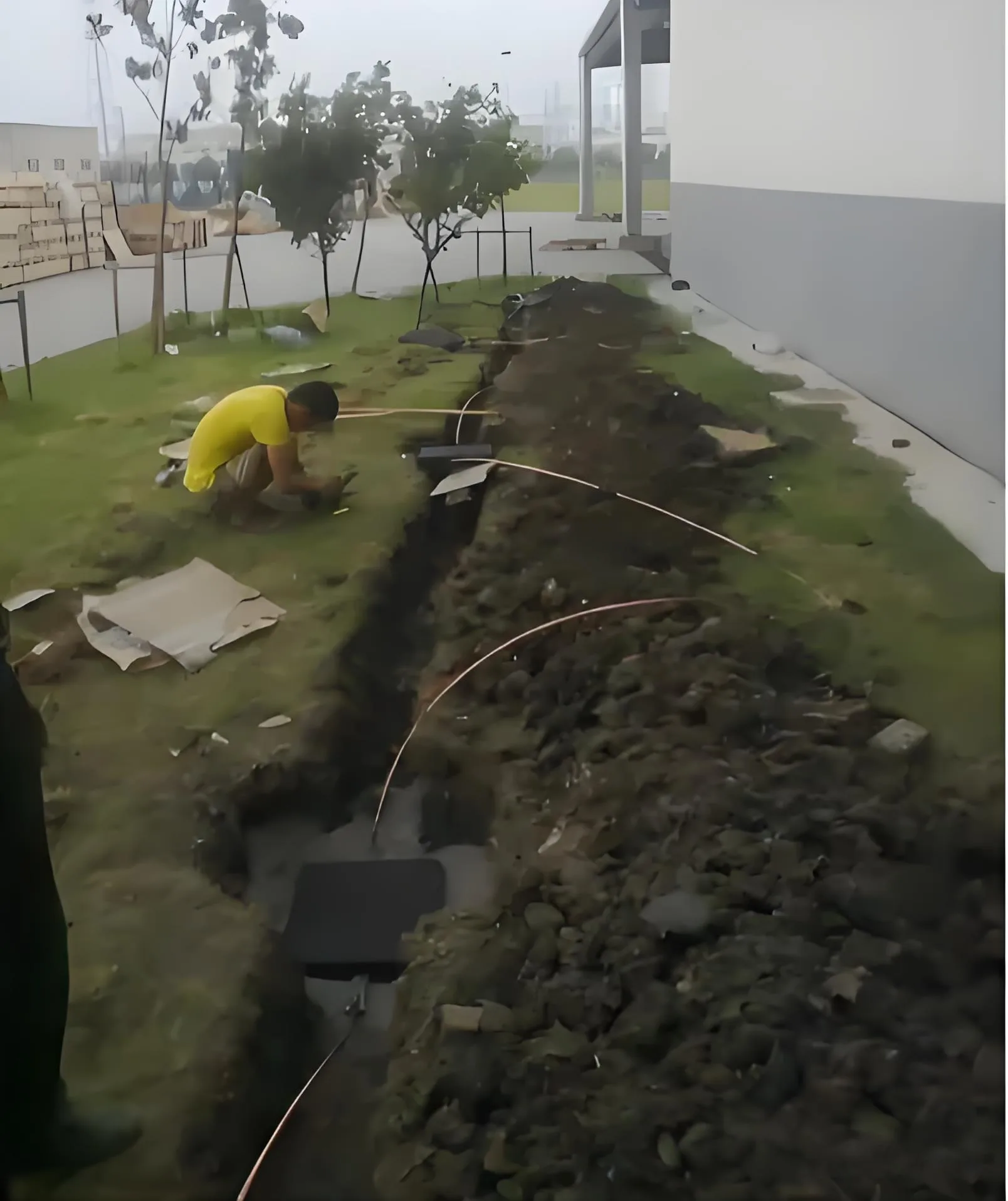 Installation must follow strict procedures: ESD ground electrodes (par ex., 3m×φ20mm copper-clad rods) are driven vertically to a depth of at least 3m below surface level. A minimum of three electrodes are arranged in a line with 3-5 meter spacing, surrounded by ground enhancement material.