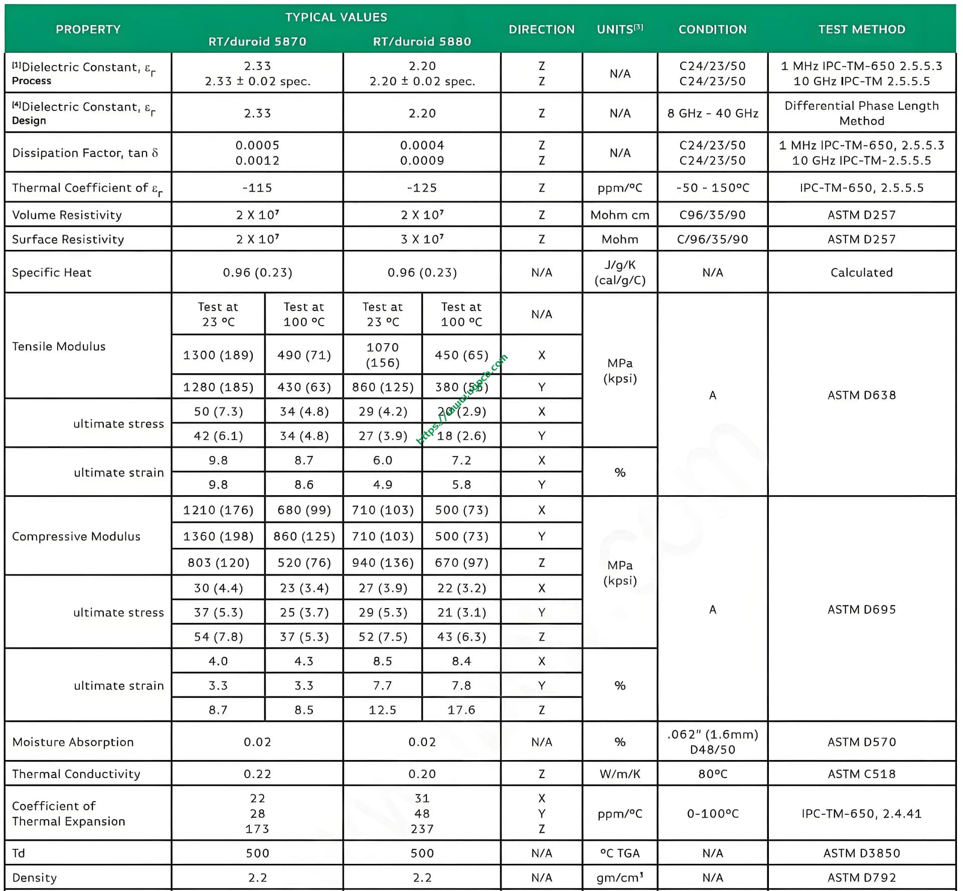 Rogers RT/duroid 5880 (Rogers 5880) il materiale è costituito da compositi PTFE rinforzati con microfibre di vetro. L'RT/duroid 5880 i laminati hanno una costante dielettrica bassa (Non so) e bassa perdita dielettrica, rendendoli adatti per applicazioni ad alta frequenza/banda larga. A contribuire a mantenere l'uniformità Dk sono le microfibre orientate in modo casuale che rinforzano i compositi PTFE.