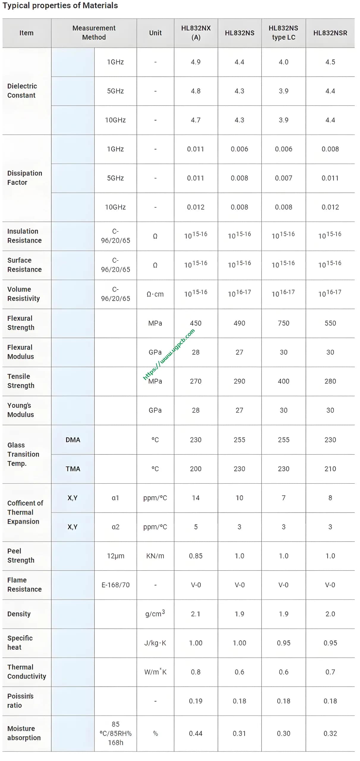 UGPCB DDRパッケージキャリアで使用される材料の典型的な特性