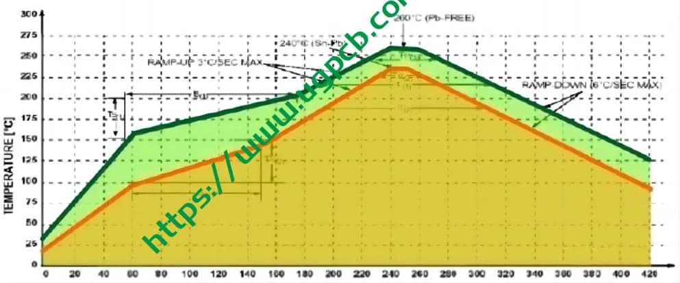 This figure compares the profiles of lead reflow and lead-free reflow. The green line covers a larger area (heat), which is the current SAC305 curve. The smaller area (heat) is the previous lead reflow. Under the premise of avoiding the explosion of the board caused by excessive high temperature and strong heat, the peak temperature of the lead-free reflow profile should not exceed 250℃. In order to maintain the same heat without damaging the PCB and components, the time of the lower peak temperature can be extended, that is, the flat-top peak temperature (240-245℃) can be extended to 10-25 seconds (depending on the size of the board). This kind of choice of lower temperature and safe heat to avoid the dangerous heat of peak temperature is what a wise person should do. This kind of risk avoidance will be very important for lead-free soldering.