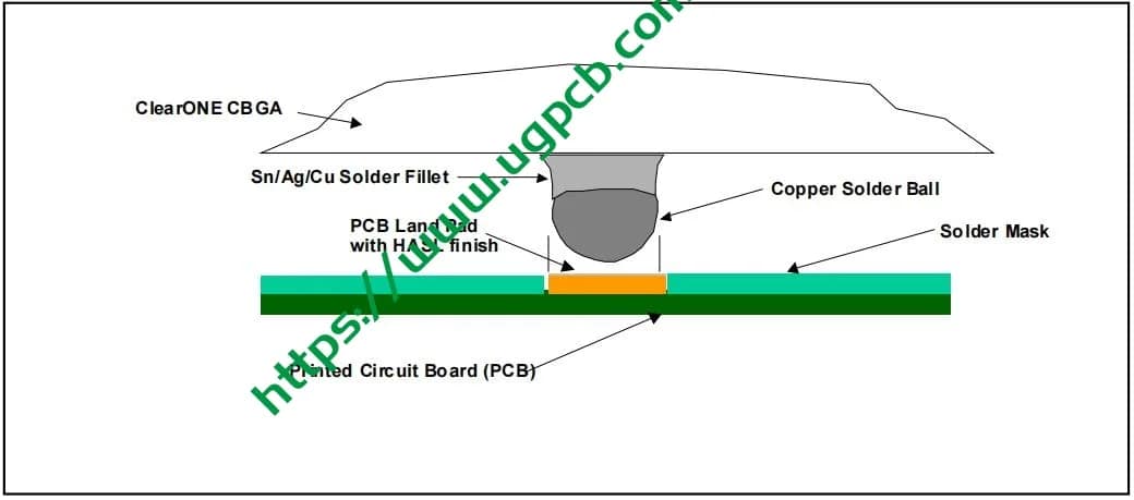 The electrical trace leading into the CBGA land pads requires a minimum width trace per the PCB board manufacturing technology used.