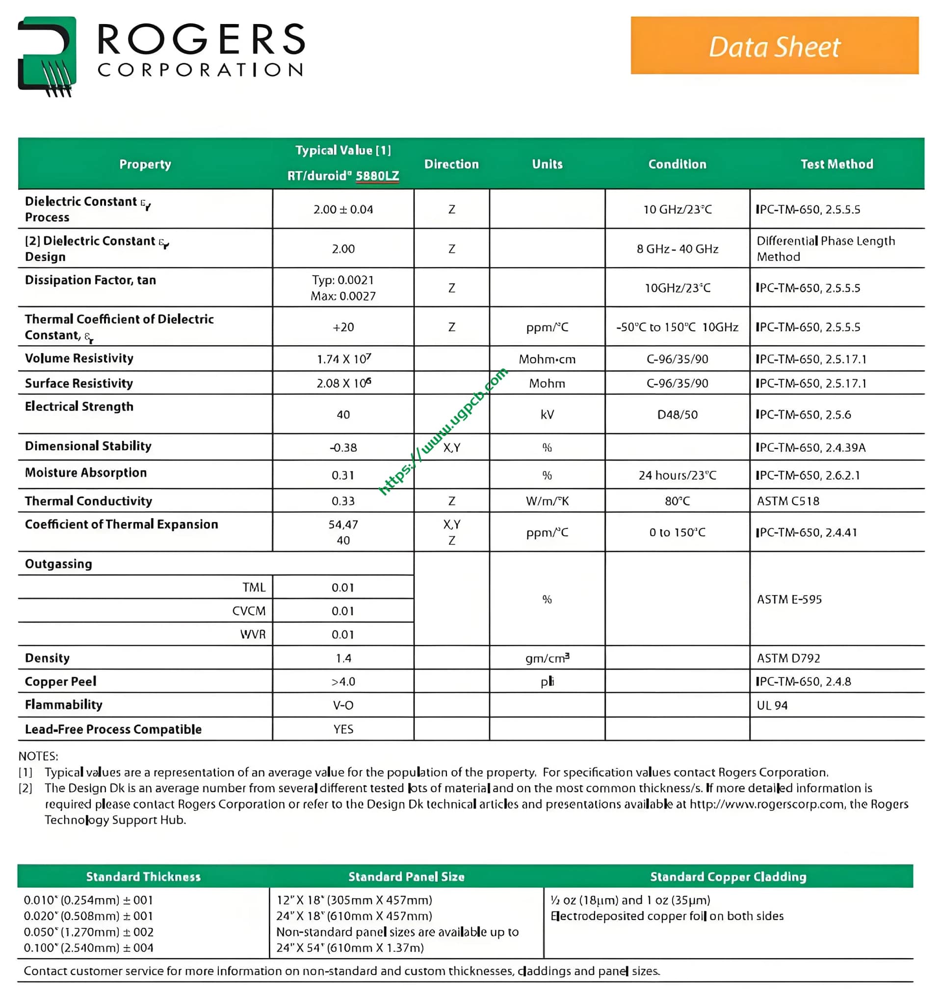 Структура RT/дуроида 5880 наполнен ПТФЭ случайными стеклянными волокнами. Наполнители RT/duroid 5880LZ отличаются внешним видом., структура, и производительность. LZ RT5880LZ относится к небольшому коэффициенту теплового расширения по оси Z.. По сравнению с RT5880, он наполнен полыми кремниевыми сферами, так он легче по весу, имеет меньший Dk, а коэффициент теплового расширения XYZ близок к коэффициенту теплового расширения меди.. Коэффициент теплового расширения высокочастотной пластины RT/duroid 5880LZ находится в диапазоне температур 0-100 степени, а коэффициент трехосного теплового расширения XYZ равен 44, 43, 41 соответственно, который подходит для изготовления многослойных печатных плат.