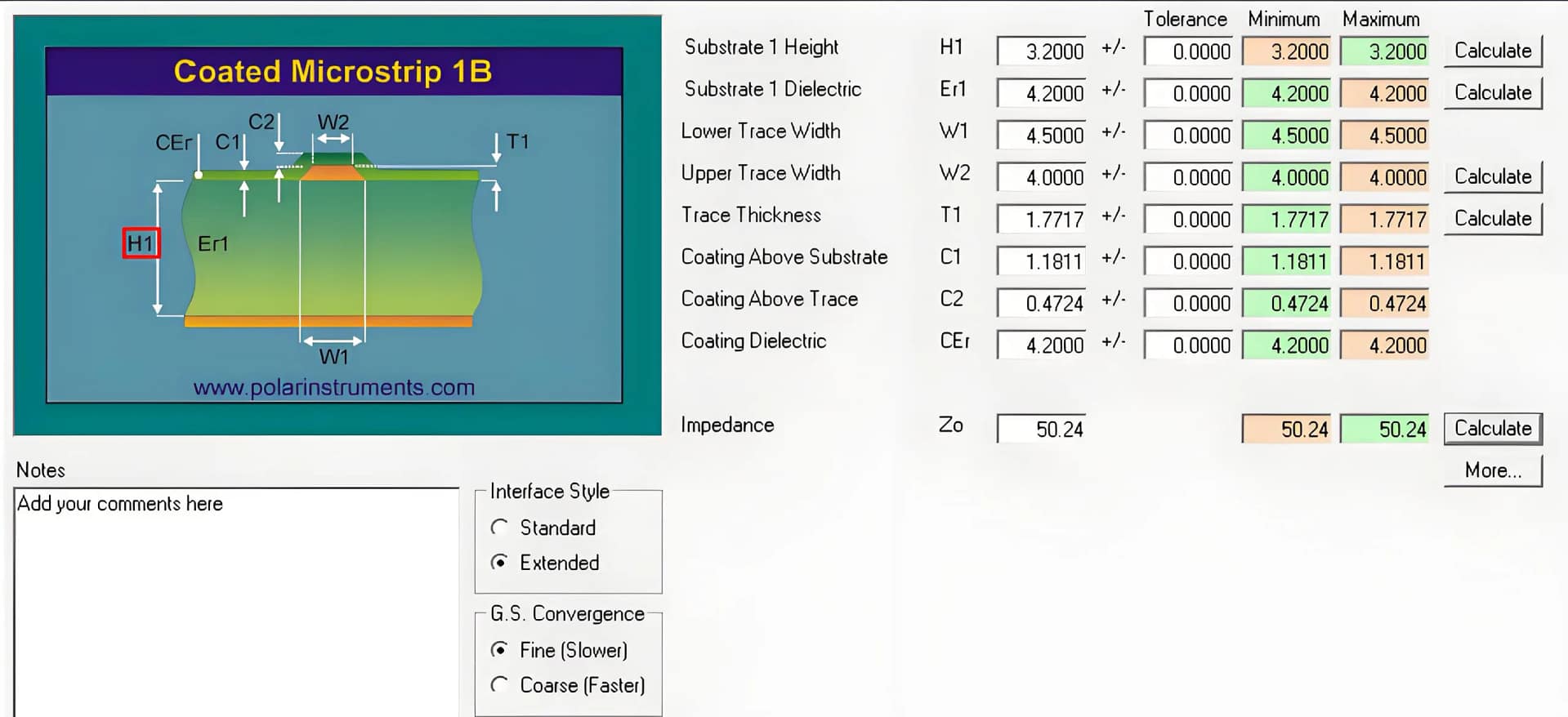 ใช้สูตรเชิงประจักษ์:w pid frac{100ชม}{\SQRT{e_r}} \รูปสี่เหลี่ยม (\ข้อความ{50microstrip}) - การจำลองที่แม่นยำ: