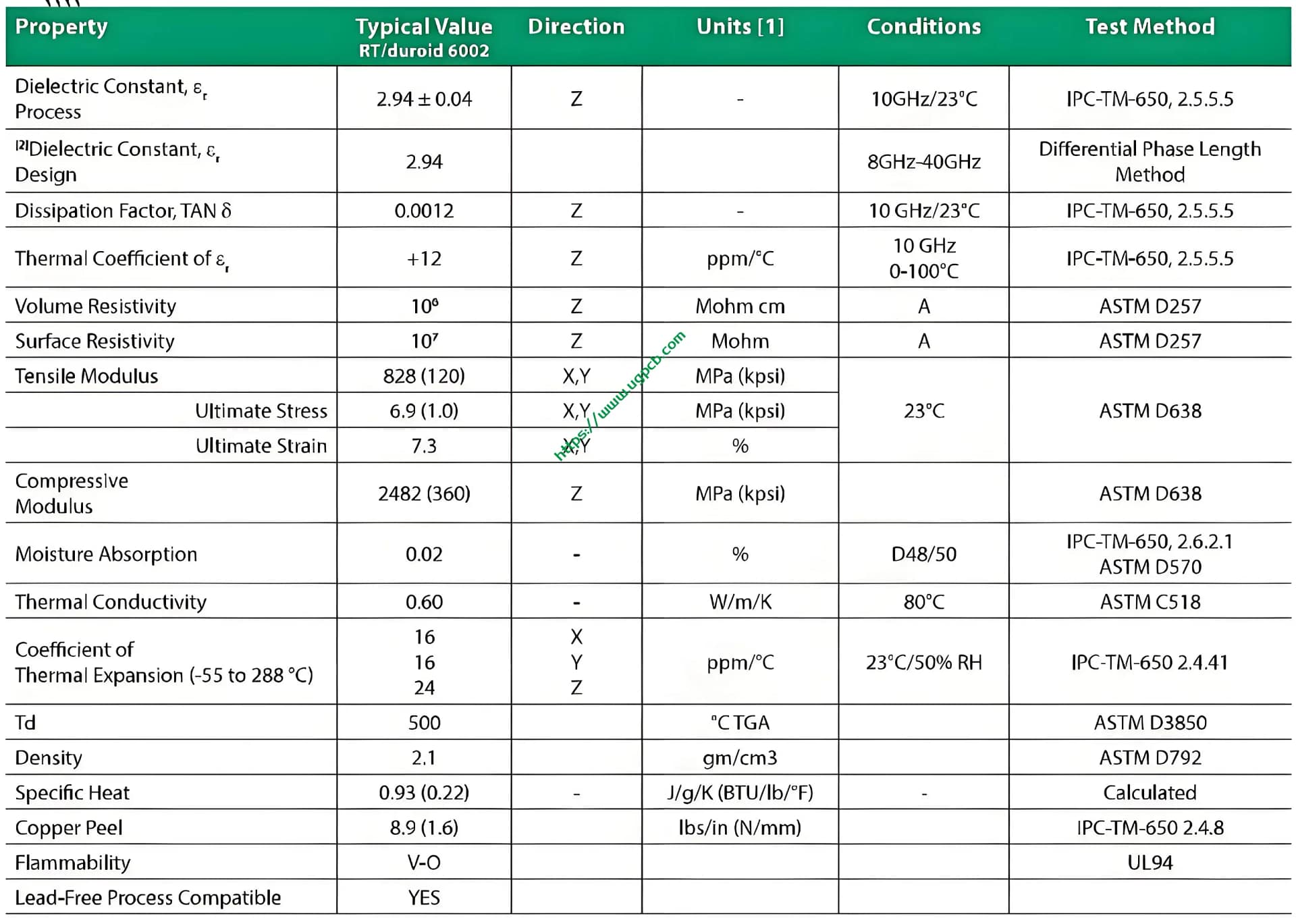 Dielectric constant (Dk) of 2.94 +/- .04 Low thermal coefficient of Dk at 12 ppm/°C Dissipation factor of .0012 at 10GHz Low Z-axis coefficient of thermal expansion at 24 ppm/°C